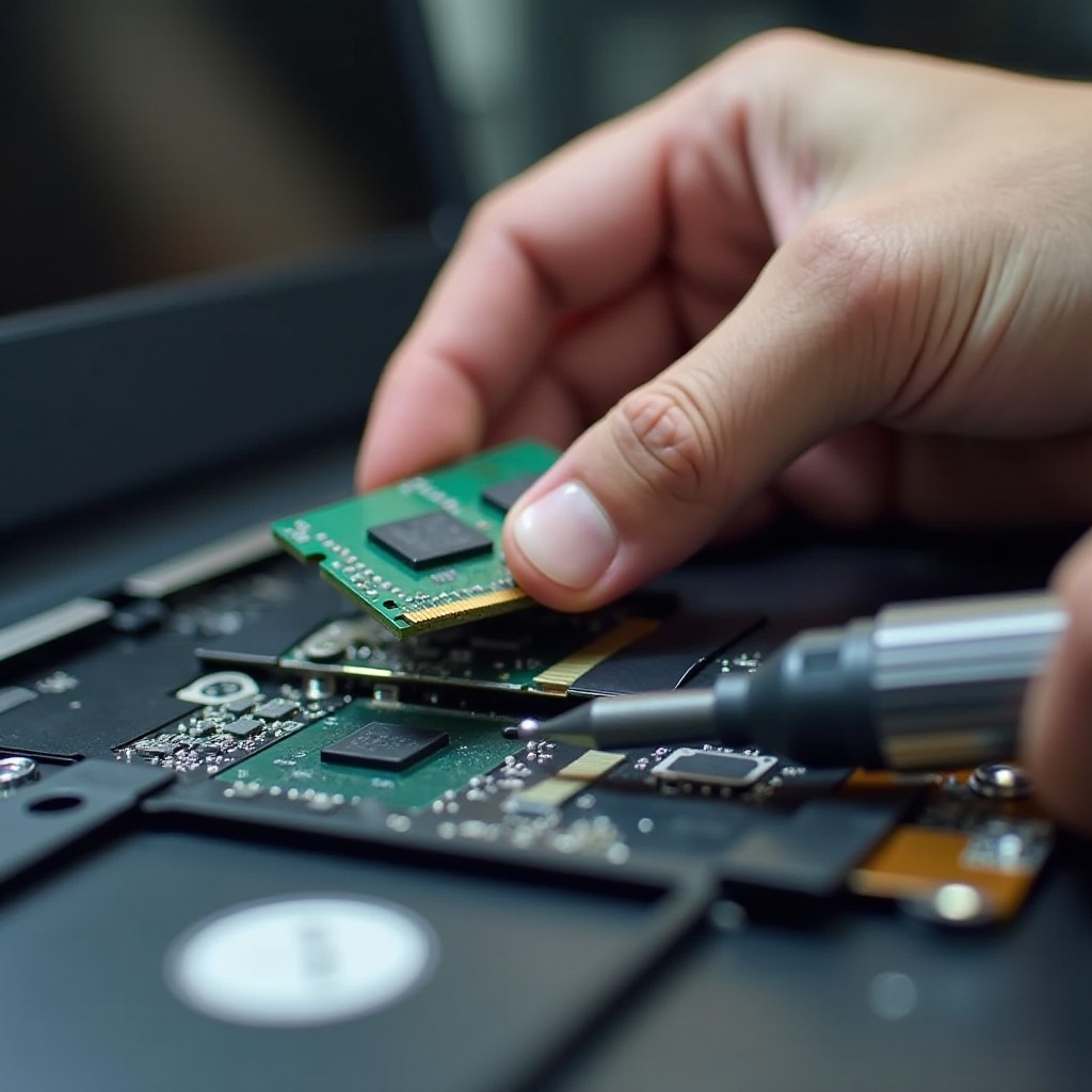 - Вставьте новое ОЗУ: Точно совместите новую планку ОЗУ со слотом, вставьте под углом и нажмите вниз, пока она не зафиксируется на месте.